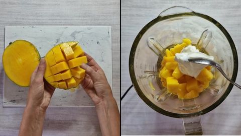 - Pelamos y cortamos el mango. Lo echamos en la batidora con dos cucharadas de yogur griego y batimos.