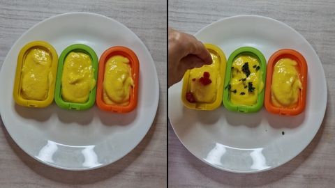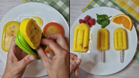 - Tapamos los moldes y los metemos al congelador, mínimo 4 horas.Si al sacar del congelador los helados están muy duros, esperar unos minutos para que se descongelen un poco.