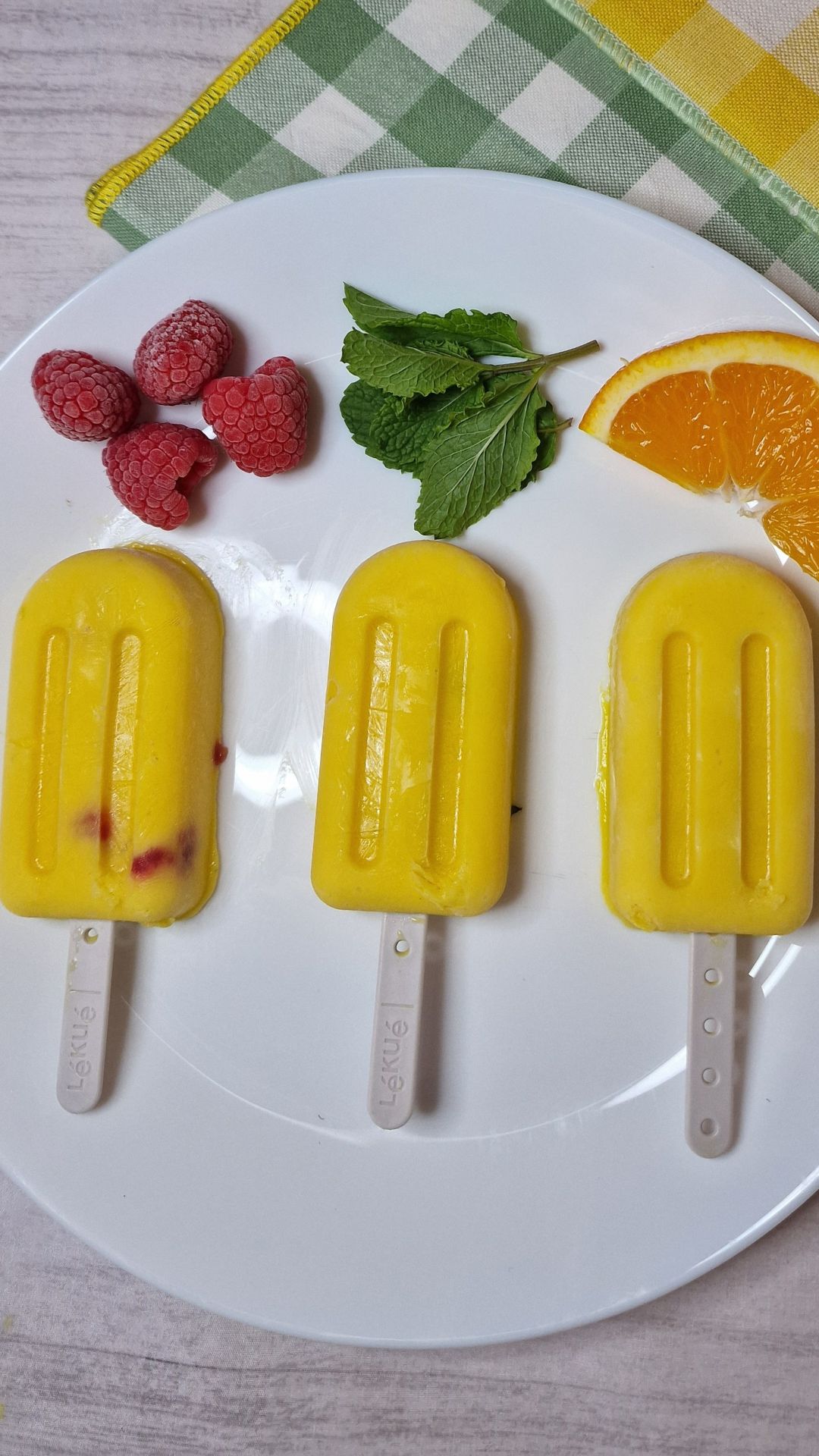 - Helado 1. echamos el jugo de media naranja y mezclamos.Helado 2. echamos las dos hojas de menta picada y mezclamos.Helado 3. echamos las frambuesas troceadas (congeladas se trocean mejor) y mezclamos.
